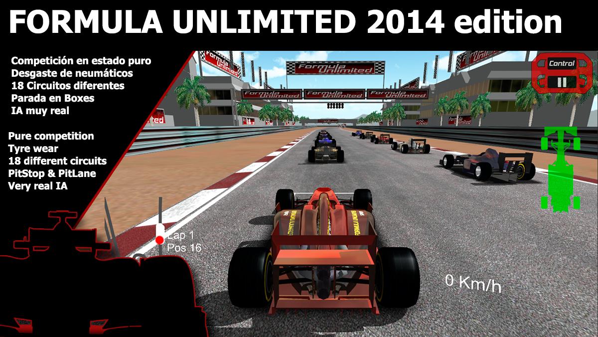 Disfruta de esta nueva versión de Formula Unlimited. Un juego de competición de alto nivel, con monoplazas exclusivos y con un rendimiento muy superior a un Formula 1 o GP2 convencionales.