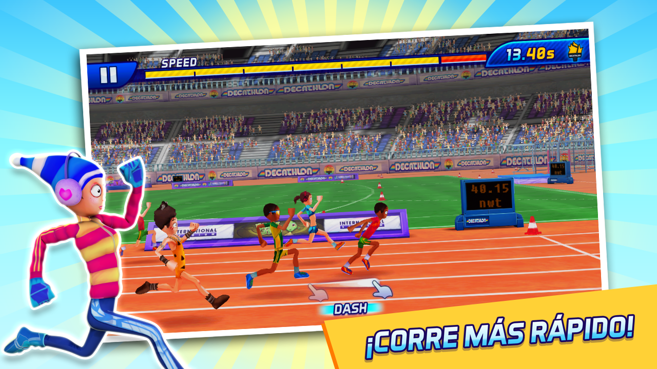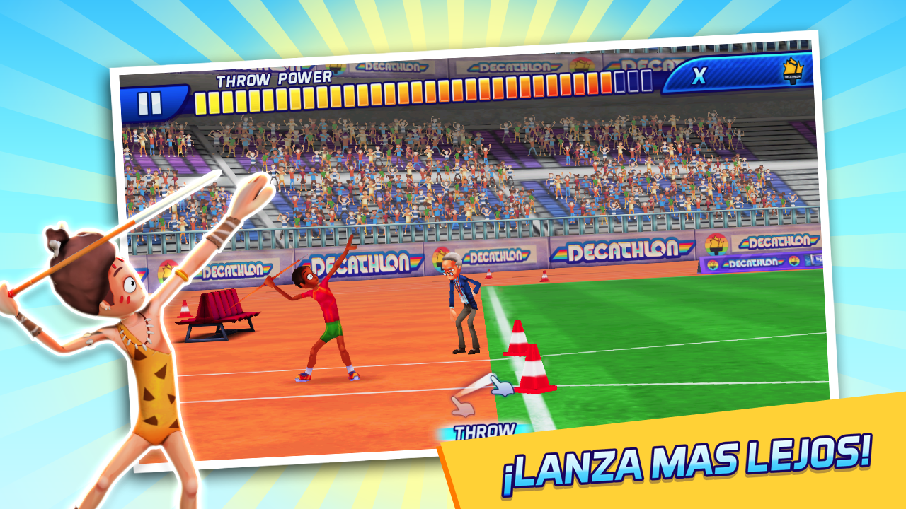 ¡Demuestra tu valía en 10 eventos! 100 m, 400 m, 1500 m, 100 m vallas, salto de longitud, salto de altura, salto con pértiga, lanzamiento de jabalina, lanzamiento de pesa y lanzamiento de disco.