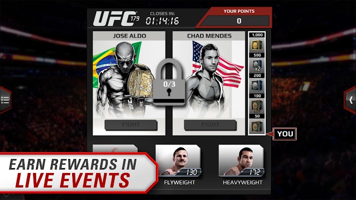Juega algunos de los más grandes combates del mundo real del UFC a través de eventos en directo en el juego. Juega programas de pelea para los próximos eventos del UFC y obtén exclusivas recompensas en el juego. ¡Cuanto más juegues, más recompensas obtendrás! Sube hasta la cima del marcador y mira cómo crecen tus beneficios.